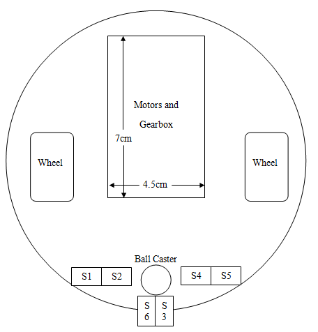 All of our turns would be reliant on sensors and not time. Whenever our robot would come up to an intersection, the robot would see what the intersection looked like using Infrared LED sensors. Once the robot knew what the intersection looked like, it would attempt it’s turn with the guide of the sensors so it would not overshoot the turn. Once the middle sensor lined up, it would proceed to solving the maze. To get a better idea of the sensor layout, here is a rough sketch of the bottom of the robot.